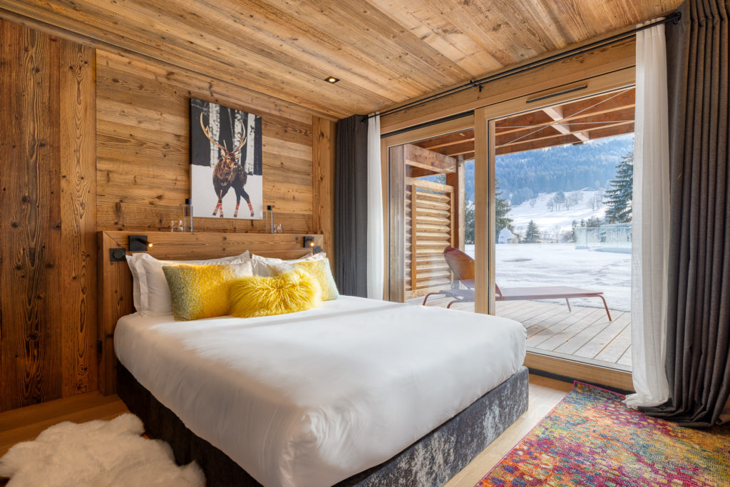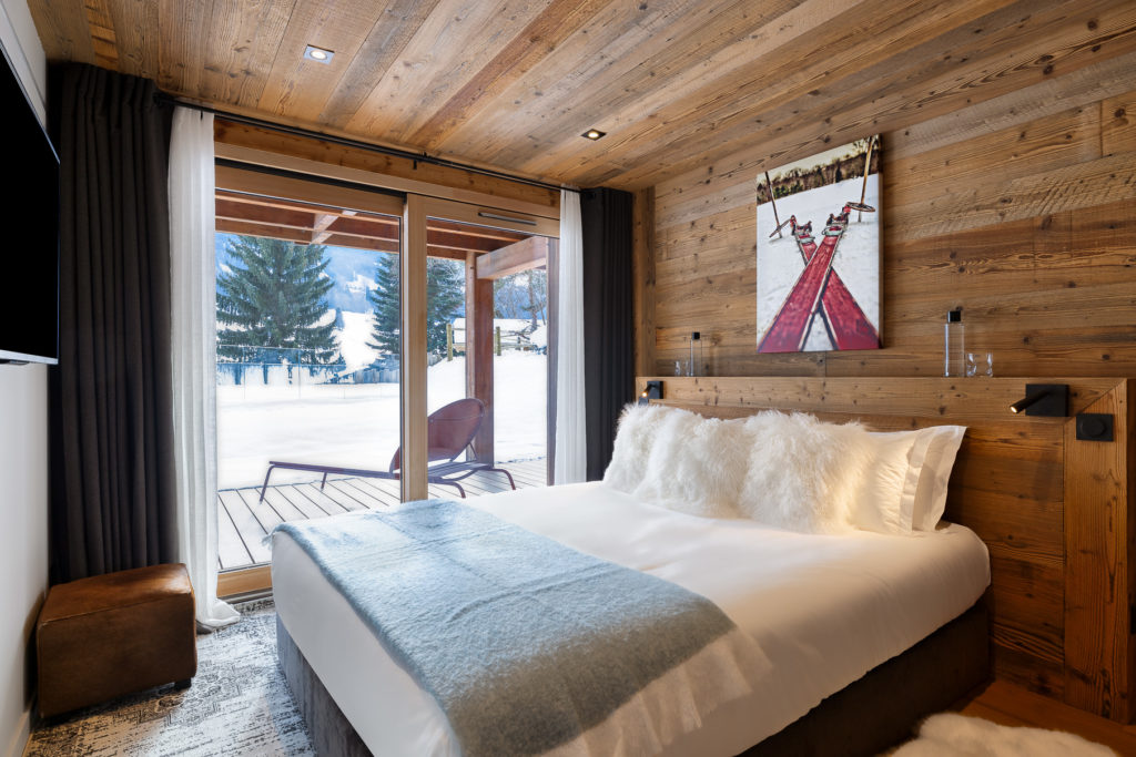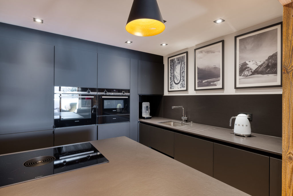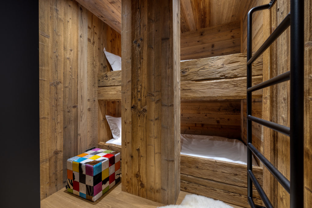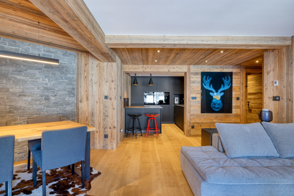 Cet appartement comprend 1 suite parentale avec sa salle de bain privée, une chambre double et un espace montagne avec lit superposés sur mesure et leur salle de bain partagée. Une grande pièce de vie avec un espace feu, un espace cuisine, un espace repas et un espace salon.