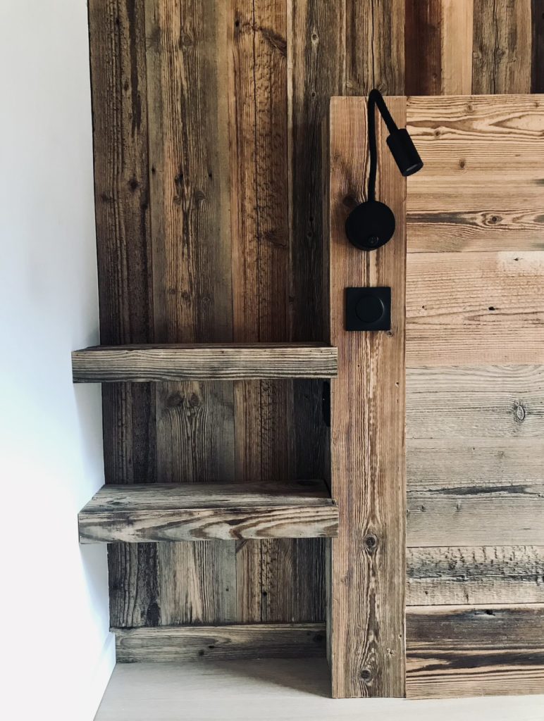 Afin d’avoir une construction unique, j’ai aussi créé de nombreux meubles sur mesure pour mes clients : dressing en vieux bois brûlé soleil, meubles vasque, bureaux et plan de travail en chêne, bibliothèque en fenix, lit jumeaux en métal et bois.