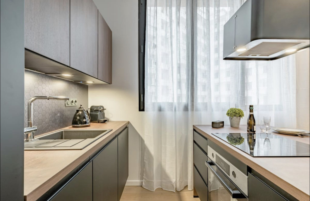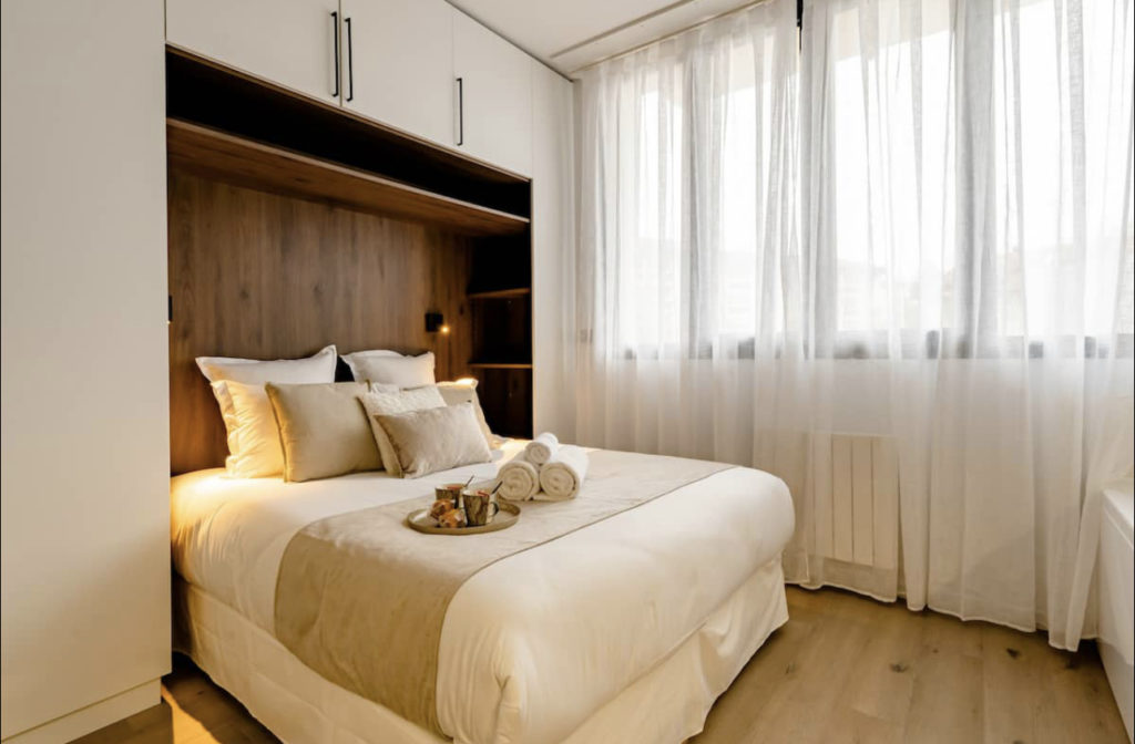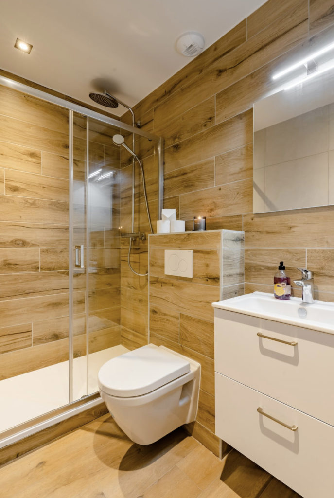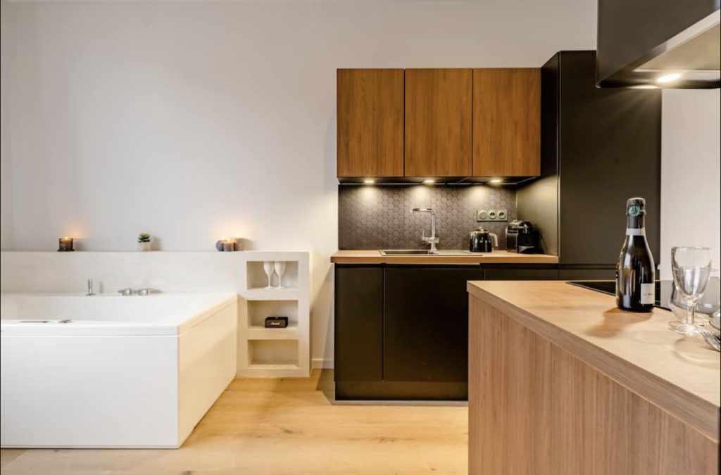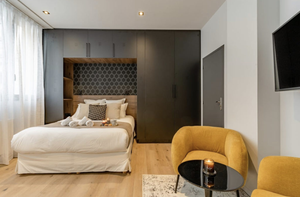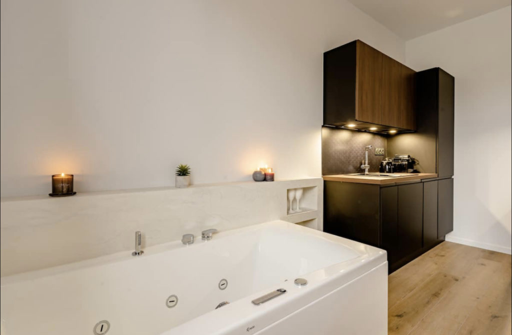 Le projet a consisté à créer un sas d’entrée pour accéder aux 2 studios ainsi que diviser les espaces de sorte à respecter les contraintes techniques. Dans ce studio le choix a été d’intégrer une baignoire balnéo pour permettre aux visiteurs de la ville d’Annecy de se détendre après leurs activités de la journée.